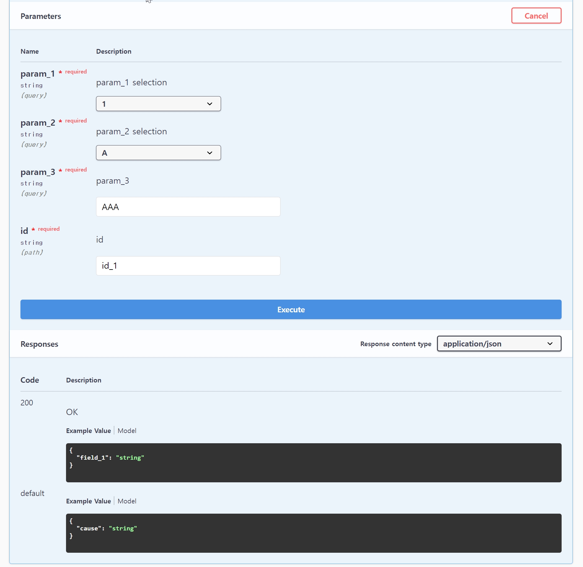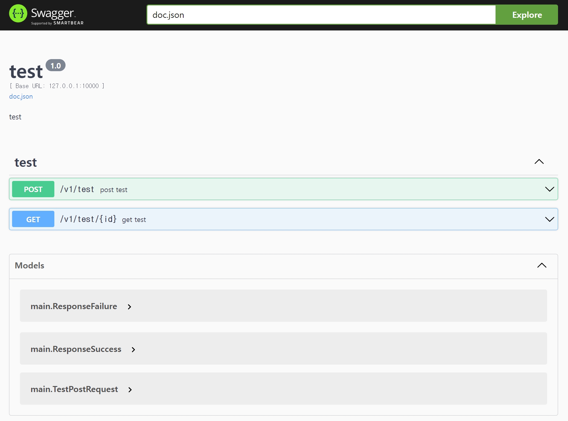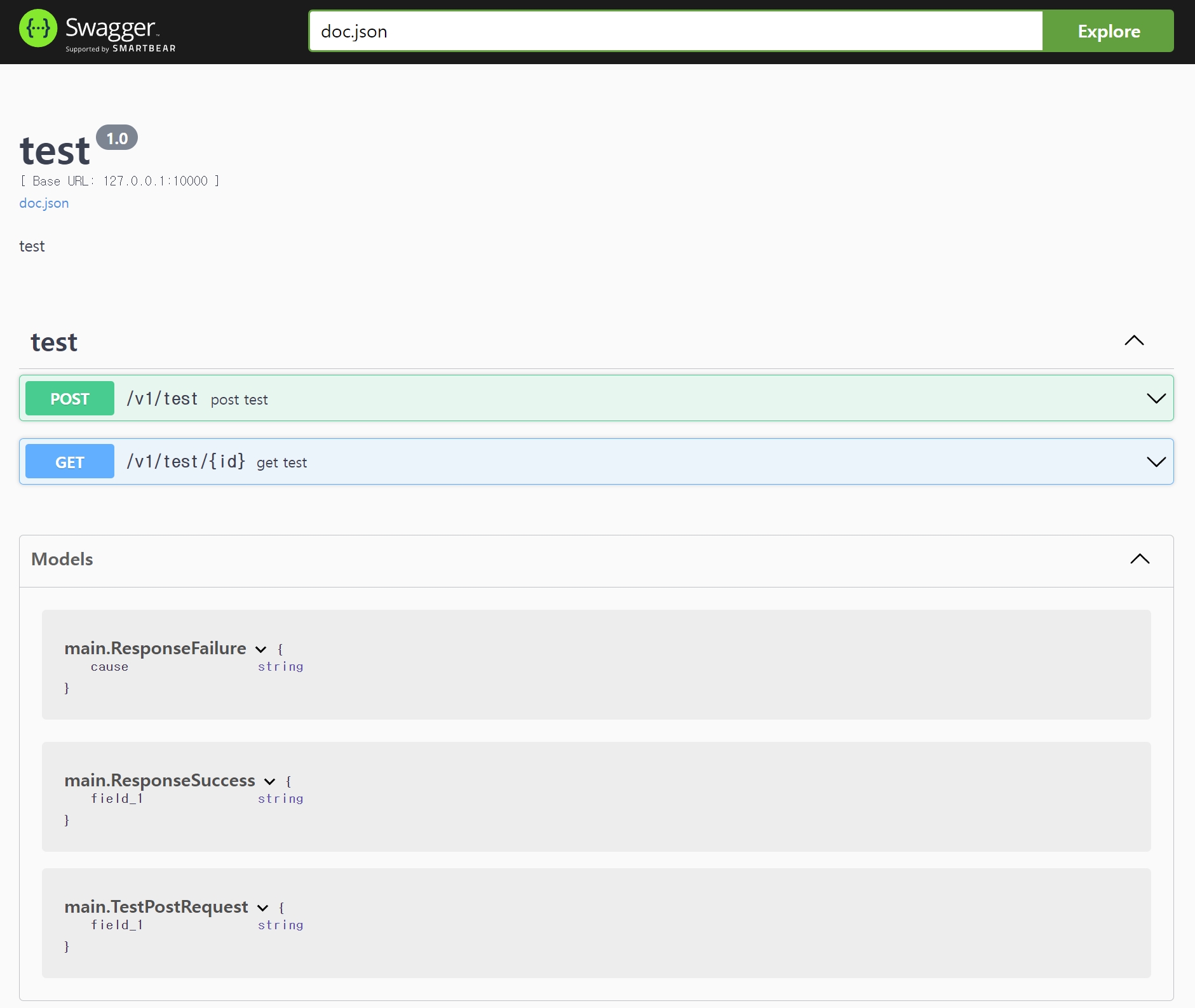 package main import ( "context" "net/http" "os" "os/signal" "sync" "syscall" "time" "test/docs" "github.com/gorilla/mux" httpSwagger "github.com/swaggo/http-swagger" ) var server *http.Server type TestPostRequest struct { Field1 string `json:"field_1",omitempty example:"value"` } type ResponseSuccess struct { Field1 string `json:"field_1"` } type ResponseFailure struct { Cause string `json:"cause"` } func loggingMiddleware(next http.Handler) http.Handler { return http.HandlerFunc(func(w http.ResponseWriter, r *http.Request) { println(r.RequestURI, r.Method, "start") defer println(r.RequestURI, r.Method, "end") next.ServeHTTP(w, r) }) } // @Summary get test // @Description get test // @Accept json // @Produce json // @Param param_1 query string true "param_1 selection" Enums(1, 2, 3) // @Param param_2 query string true "param_2 selection" Enums(A, B, C, D) default(A) // @Param param_3 query string true "param_3" default(AAA) // @Param id path string true "id" default(id_1) // @Success 200 {object} ResponseSuccess // @Failure default {object} ResponseFailure // @Router /v1/test/{id} [get] // @tags test func testGet(w http.ResponseWriter, r *http.Request) { w.WriteHeader(http.StatusOK) w.Write([]byte(`{"field_1" : "get ok"}`)) } // @Summary post test // @Description post test // @Accept json // @Produce json // @Param id path string true "id" default(aaa) // @Param request body TestPostRequest true "country selection" // @Success 200 {object} ResponseSuccess // @Failure default {object} ResponseFailure // @Router /v1/test [post] // @tags test func testPost(w http.ResponseWriter, r *http.Request) { w.WriteHeader(http.StatusOK) w.Write([]byte(`{"cause" : "post fail"}`)) } func run(wg *sync.WaitGroup, done chan int) { defer wg.Done() go finalize(done) docs.SwaggerInfo.Version = "1.0" docs.SwaggerInfo.Host = "127.0.0.1:10000" docs.SwaggerInfo.BasePath = "" docs.SwaggerInfo.Title = "test" docs.SwaggerInfo.Description = "test" router := mux.NewRouter() router.Use(loggingMiddleware) router.PathPrefix("/swagger/").Handler(httpSwagger.WrapHandler) router.HandleFunc("/v1/test/{id:[a-z,A-Z][a-z,A-Z,0-9,--,_,.]+}", testGet).Methods("GET") router.HandleFunc("/v1/test", testPost).Methods("POST") server = &http.Server{ Addr: ":10000", Handler: router} server.ListenAndServe() } func finalize(done chan int) { for len(done) == 1 { time.Sleep(1 * time.Second) } if server != nil { ctx, cancel := context.WithTimeout(context.Background(), 5*time.Second) cancel() server.Shutdown(ctx) } } func main() { var wg sync.WaitGroup done := make(chan int, 1) done <- 1 signals := make(chan os.Signal, 1) signal.Notify(signals, syscall.SIGINT, syscall.SIGTERM) wg.Add(1) go run(&wg, done) <-signals <-done wg.Wait() }