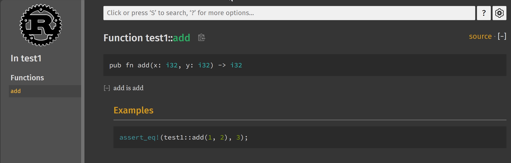 //! test1 is test1 /// add is add /// /// # Examples /// /// ``` /// assert_eq!(test1::add(1, 2), 3); /// ``` pub fn add(x: i32, y: i32) -> i32 { x + y }