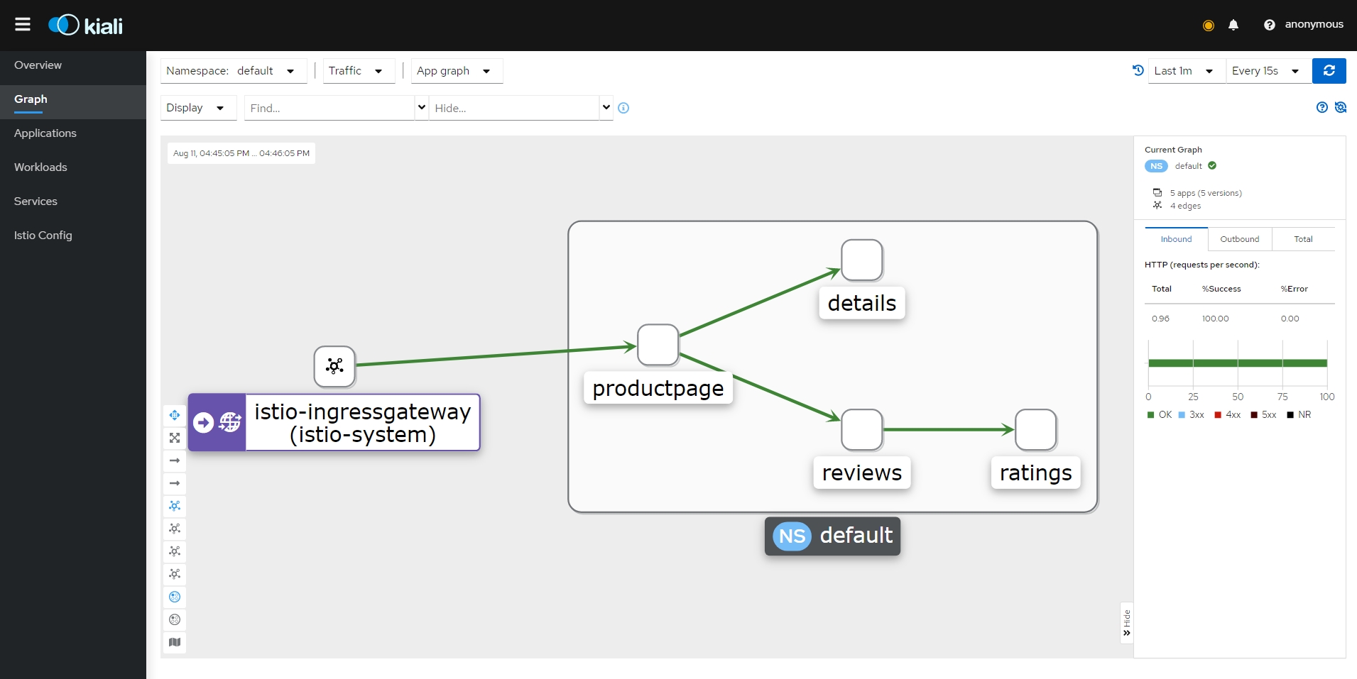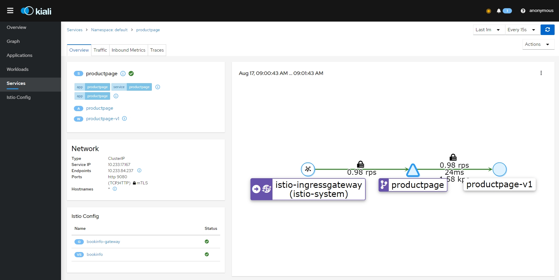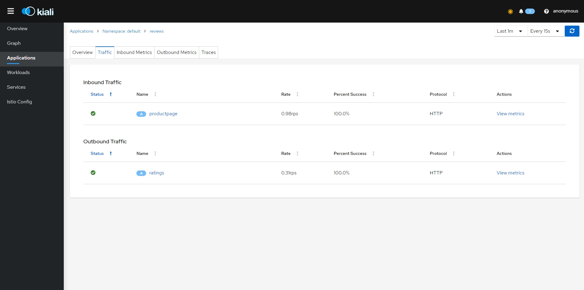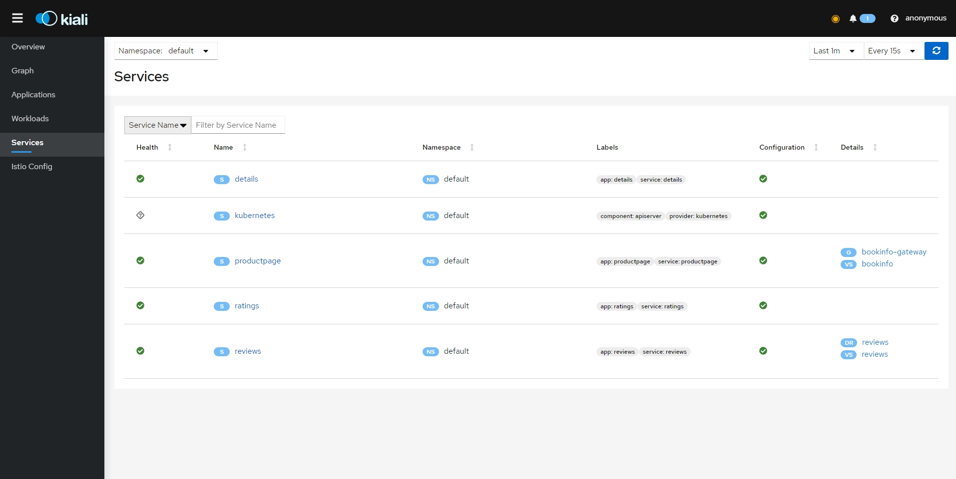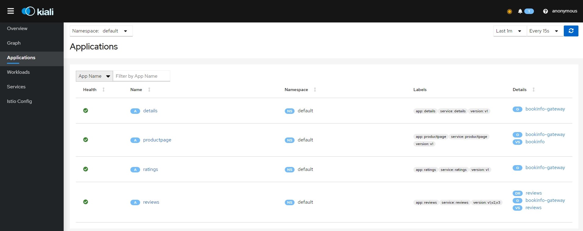 - bookinfo 네임스페이스의 모든 서비스가 동일한 네임스페이스 및 Istio 컨트롤 플레인(Istio의 송신 및 원격 측정 기능에 필요)에서 실행되는 서비스에만 도달하도록 구성