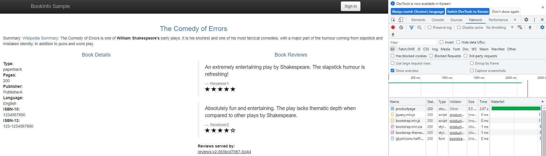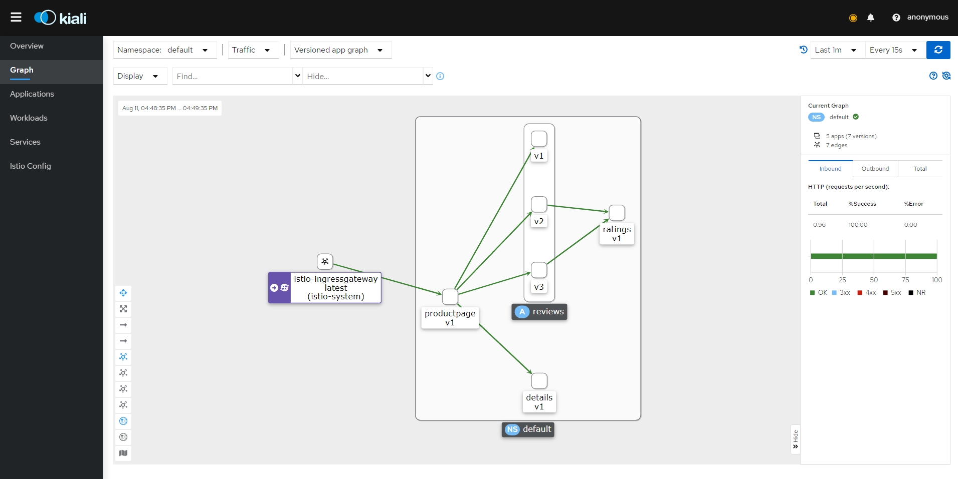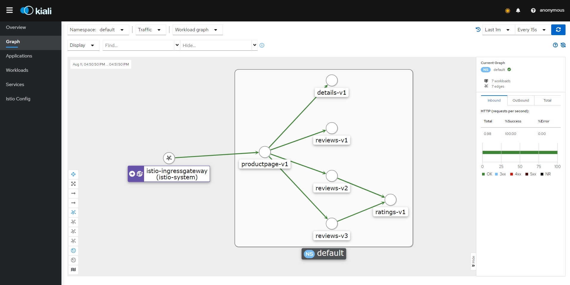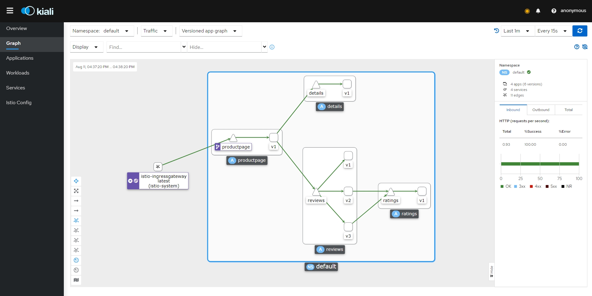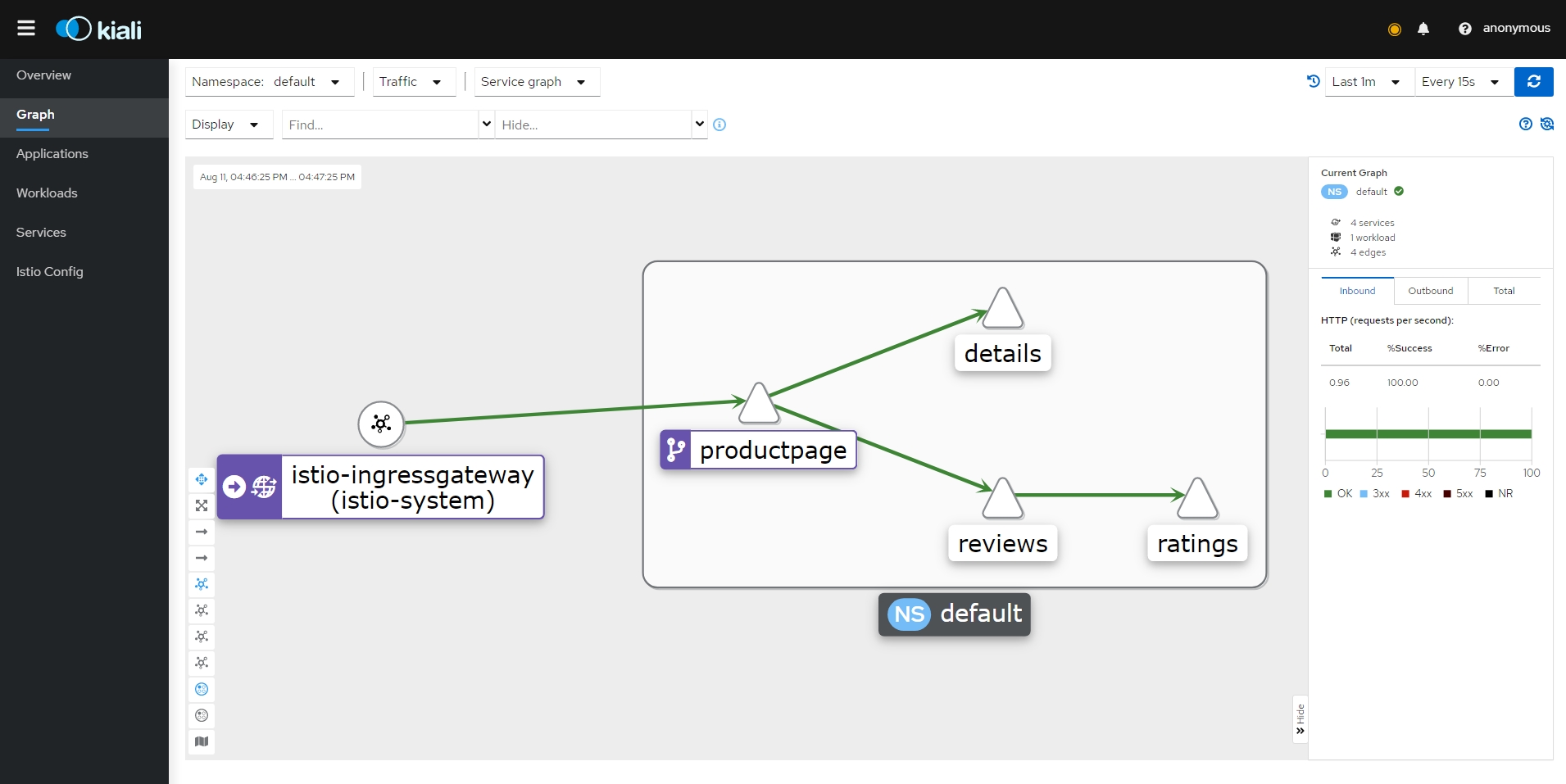 - bookinfo 네임스페이스의 모든 서비스가 동일한 네임스페이스 및 Istio 컨트롤 플레인(Istio의 송신 및 원격 측정 기능에 필요)에서 실행되는 서비스에만 도달하도록 구성