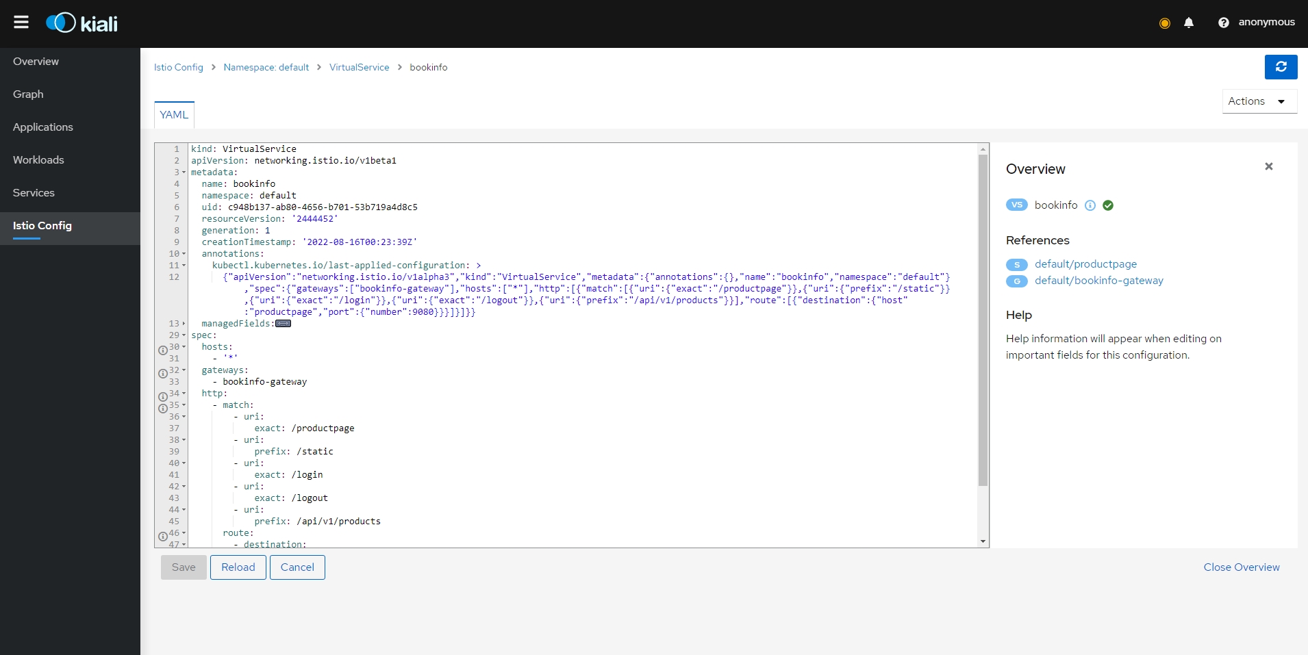apiVersion: networking.istio.io/v1alpha3 kind: VirtualService metadata: name: bookinfo spec: hosts: - bookinfo.com http: - match: - uri: prefix: /reviews route: - destination: host: reviews - match: - uri: prefix: /ratings route: - destination: host: ratings