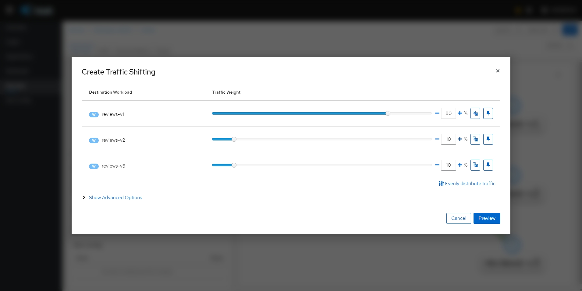 apiVersion: networking.istio.io/v1alpha3 kind: VirtualService metadata: name: reviews spec: hosts: - reviews http: - match: - headers: end-user: exact: jason route: - destination: host: reviews subset: v2 weight: 75 - route: - destination: host: reviews subset: v3 weight: 25