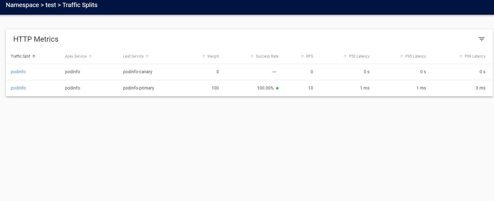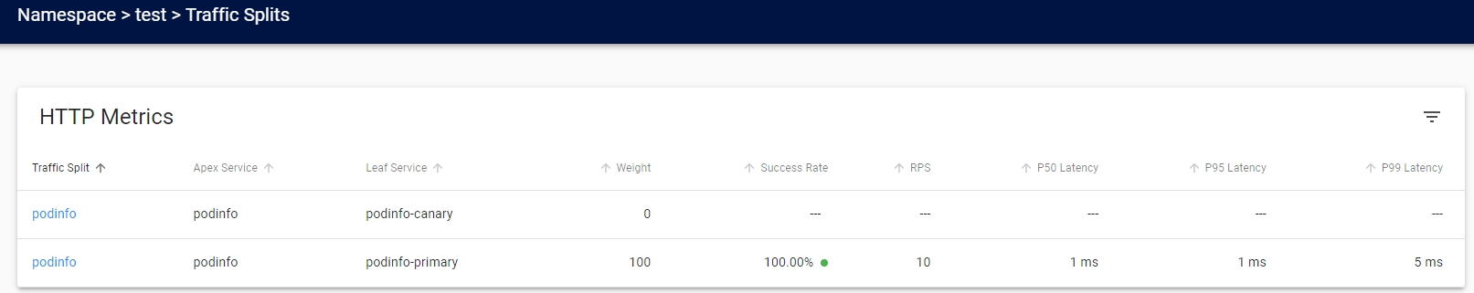 apiVersion: flagger.app/v1beta1 kind: Canary metadata: name: podinfo namespace: test spec: targetRef: apiVersion: apps/v1 kind: Deployment name: podinfo service: port: 9898 analysis: interval: 10s threshold: 5 stepWeight: 10 maxWeight: 100 metrics: - name: request-success-rate thresholdRange: min: 99 interval: 1m - name: request-duration thresholdRange: max: 500 interval: 1m