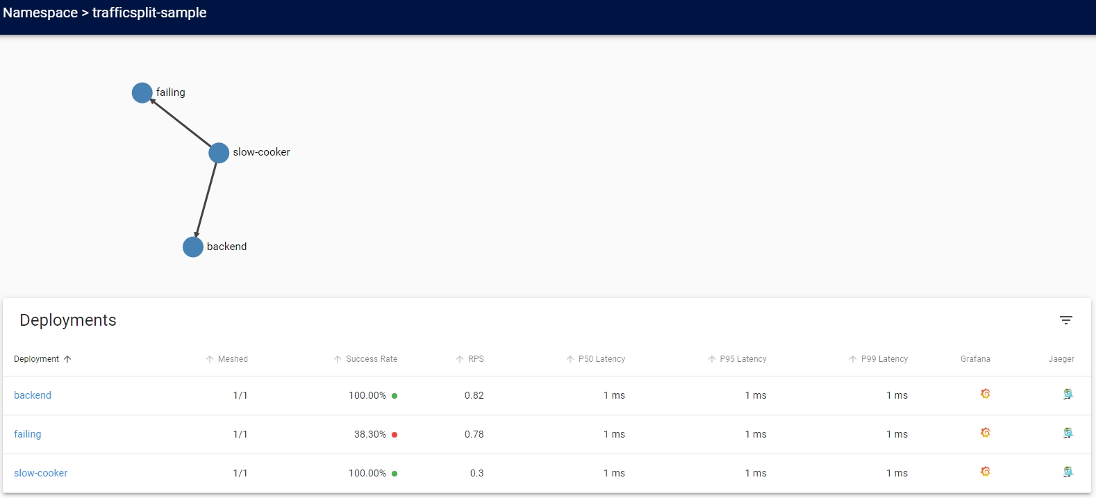 apiVersion: split.smi-spec.io/v1alpha2 kind: TrafficSplit metadata: name: backend-split namespace: trafficsplit-sample spec: service: backend-svc backends: - service: backend-svc weight: 500 - service: failing-svc weight: 500